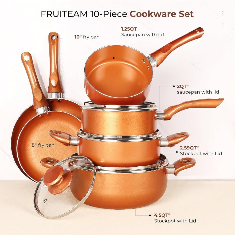 • [Multifunctional 10-piece Cookware Set]FRUITEAM kitchenware set includes 8-inch & 10-inch fry pan, 1.25-quart & 2-quart sauce pan with lid, 2.59quart & 4.5-quart stock pot with lid, meeting your various demands of everyday cooking for you & your family