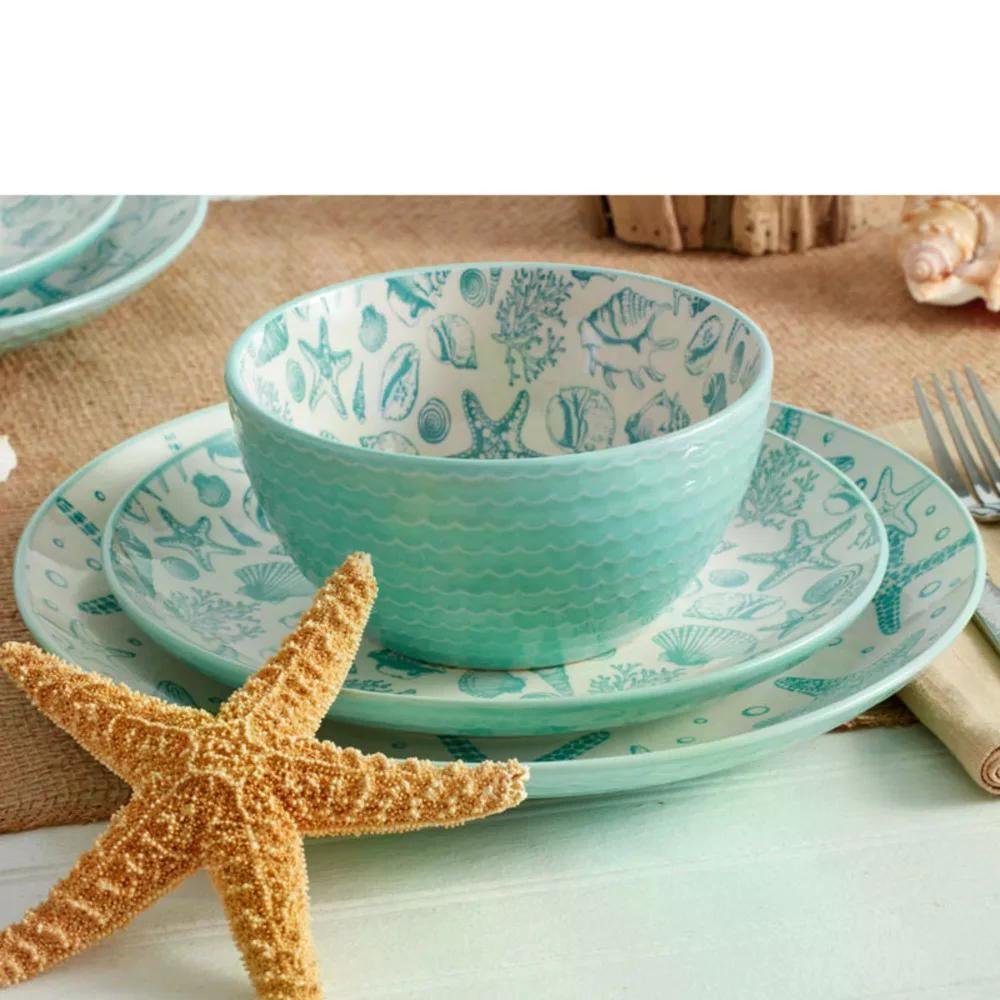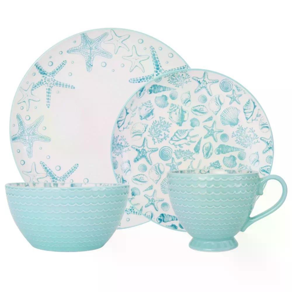 This Pfaltzgraff Venice 16-Piece dinnerware set features an array of starfish, shells and other coastal icons with a wave-like textured exterior. The set is crafted from high quality stoneware for lasting beauty. This 16-piece dinnerware set, service for four, includes (4) each: 11 inch dinner plate, 8 inch salad plate, 6 inch diameter soup cereal bowl and 14 ounce mug. The beautifully detailed design compliments any decor and is perfect for everyday use. Dishwasher and microwave safe.