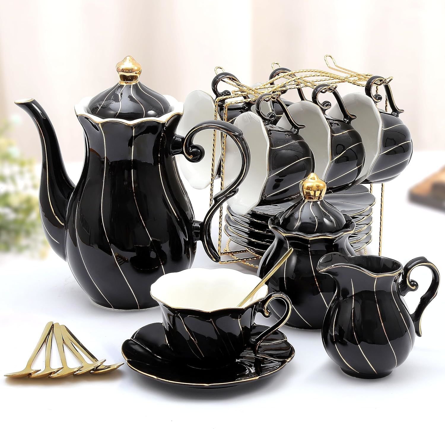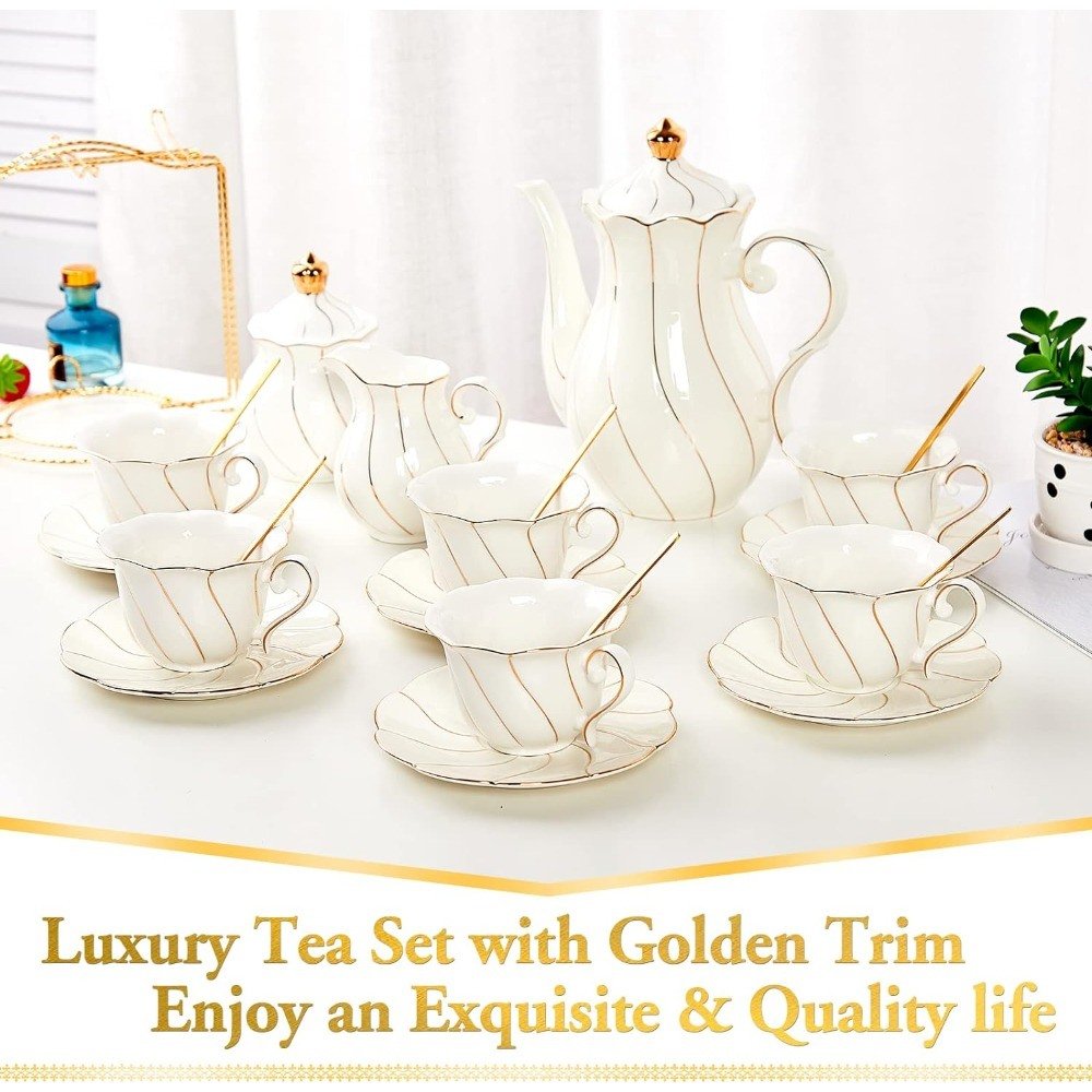• [Luxury British Style Tea Set in Golden Trim]This beautiful teapot set comes with 1 teapot (47oz), 6 porcelain teacups (7oz), 6 saucers (6in), 6 spoons, 1 sugar bowl (12oz), 1 creamer (8oz) & 1 exquisite stand. Pumpkin design and petal edge decorated with golden trim, it can be a great coffee or tea set for entertainment with your friends, an elegant way to enjoy your life.