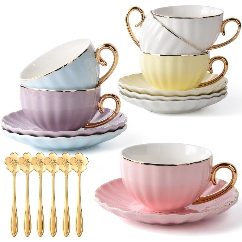 • Ideal Choice: 2 yellow, 2 purple, 2 pink, a total of 3 colors, Cup and saucer set comes with 6 cups (8.4 oz/250ml), 6 saucers (6.1in), 6 spoon (5in). The coffee cup and saucer set are perfect for cappuccino, espresso, macchiato, caffe latte, demitasse, tea and coffee