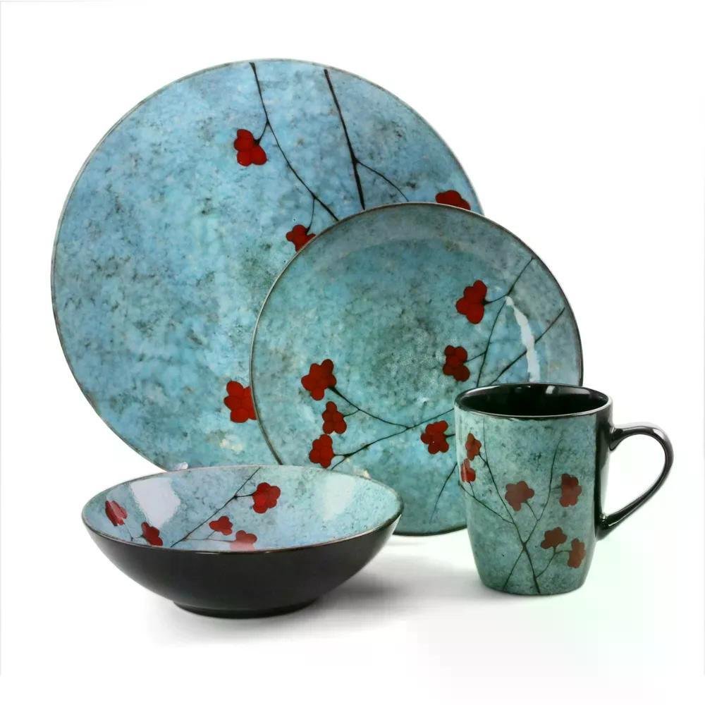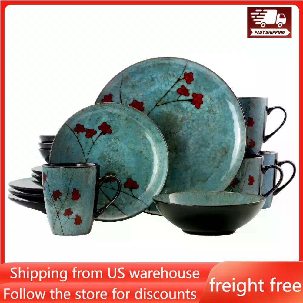 Floral Accents 16 Piece Stoneware Dinnerware Set in Blue Free Shipping Dinner Plates Set Ceramic Dishes to Eat Food Plate Dish