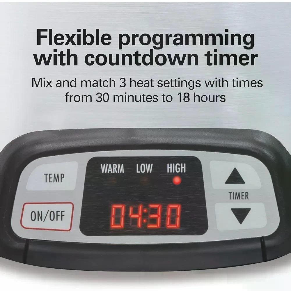 Just choose warm, low or high heat settings and program the cooking time from 30 minutes up to 18 hours. The convenient countdown timer shows you how long until food is ready.