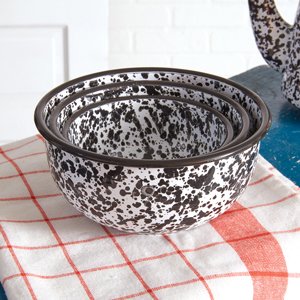 Inspired by vintage enamel finds, our enamelware features a splattered black and white finish, the perfect addition to a country kitchen. True to tradition, our enamelware line is created to last for generations to come. This item is food safe. Hand wash only. The smallest bowl measures 4½'' dia. x 2¼''H and the medium bowl measures 5¼'' dia. x 2½''H.