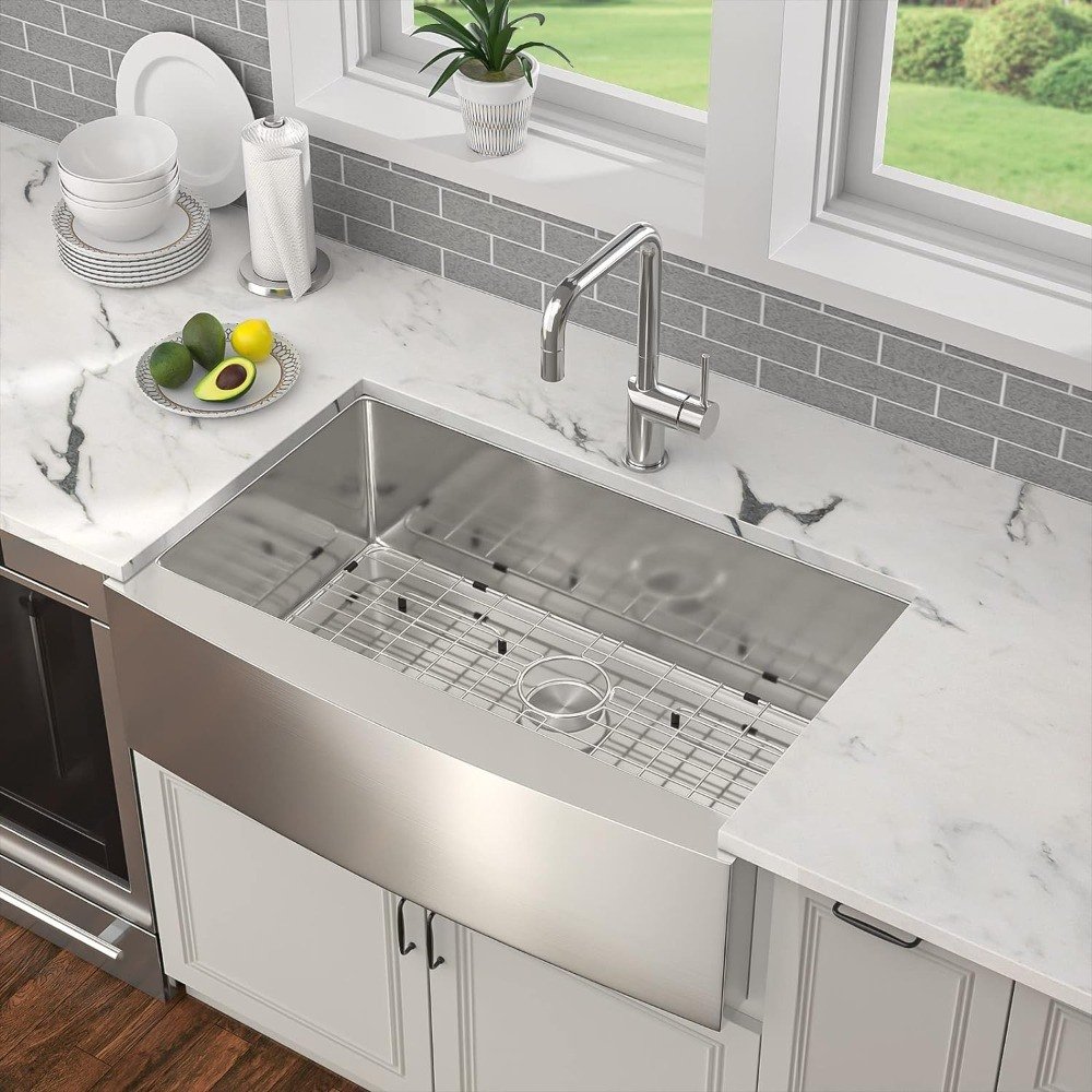• Comprehensive Package: The farmer kitchen sink package includes everything you need for installation and maintenance, including the 30" stainless steel kitchen sink itself, a drain assembly, a convenient roll-up rack, a bottom rinse grid for added protection, as well as installation clips and guidance for a hassle-free setup.