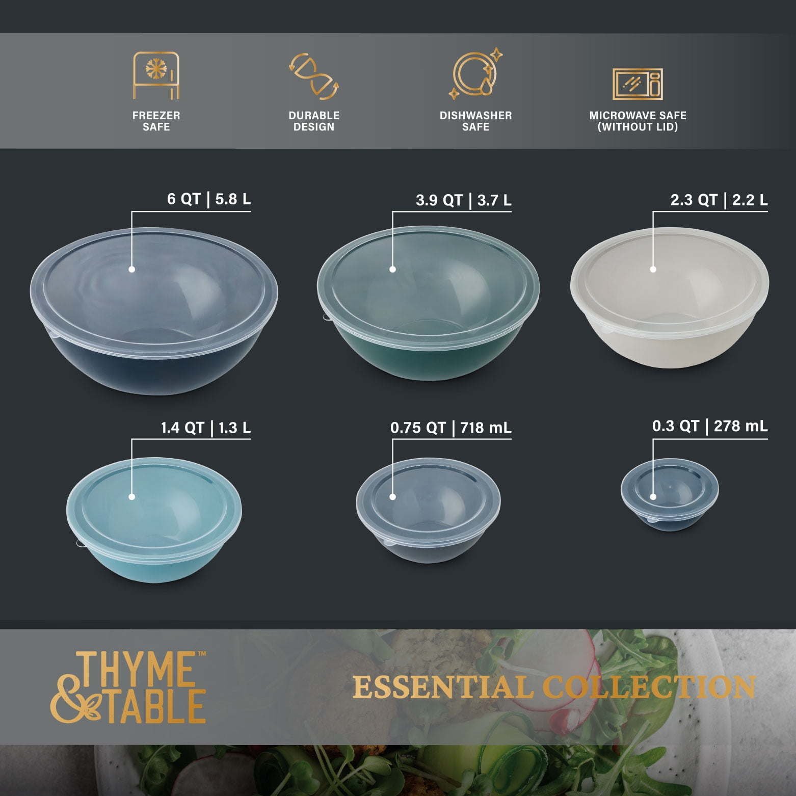 Introducing the Thyme & Table 12-Piece Mixing Bowl Set, a comprehensive solution to meet all your kitchen needs with ease. This versatile set includes six mixing bowls in various sizes, ranging from 0.3 quart to 6 quarts, ensuring you have the perfect bowl for every task. Crafted for convenience, each bowl features an easy-grip design for comfortable handling, while the nesting function saves valuable storage space in your kitchen. The set also includes easy-grip lids for each bowl, allowing you to seamlessly transition from mixing to storing leftovers or prepping ingredients in advance. Whether you're whisking batter, tossing salads, or marinating meats, the Thyme & Table Mixing Bowl Set provides the versatility and durability you need to tackle any culinary challenge. Elevate your cooking experience and streamline your meal prep with this essential kitchen set.
