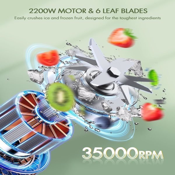 • [2200W High Power Blenders for Kitchen]Vewior blender for shakes and smoothies boasts a robust powerful 2200W motor capable of reaching speeds of up to 35000 RPM/min, making it outperform other smoothie blenders when it comes to crushing ice with greater speed and efficiency. It features an enhanced food-grade 6-leaf sharp blade specifically engineered for effortless ice crushing, making it an ideal choice for creating smoothies and frozen drinks.