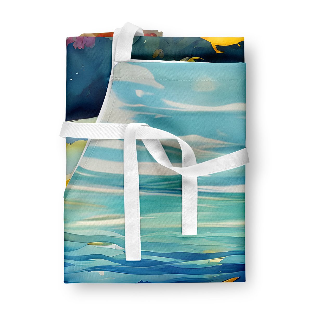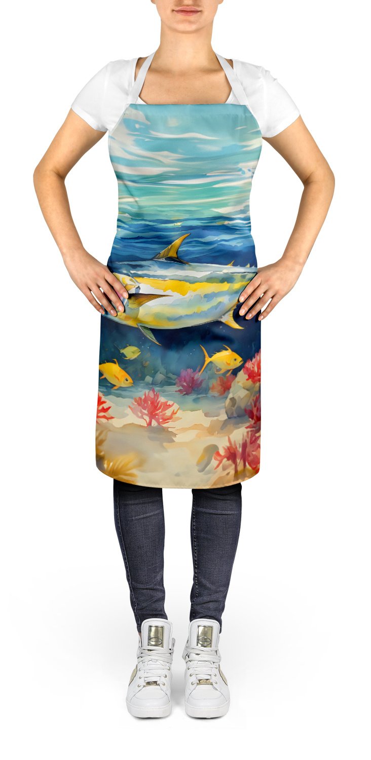 Apron featuring breed specific Yellowfin Tuna artwork. Elevate your cooking, baking, and grilling experiences with our versatile Kitchen or BBQ Apron. This Bib Style apron isn't just limited to culinary activities - it also serves as an excellent baking apron, artist apron, server apron, gardening apron, or even a dog grooming apron. The apron showcases vibrant full-color artwork contributed by one of our talented artists, bringing a dash of style to your daily tasks. With dimensions of approximately 27"W x 30"H, it provides ample coverage to protect your clothing from spills and splashes. Our apron is meticulously crafted from 100% Ultra Spun Polyester, known for its durability and lightweight nature. The apron comes with white tie straps, ensuring a comfortable and adjustable fit for all. It's a perfect choice for kitchen apron enthusiasts, whether you are a woman or a man. Designed for easy maintenance, this apron is fully machine washable. The quick-drying polyester material actively reduces staining, keeping your apron looking fresh and new for longer. Our beautifully designed apron isn't just a functional kitchen accessory - it's a fashion statement in the culinary world!